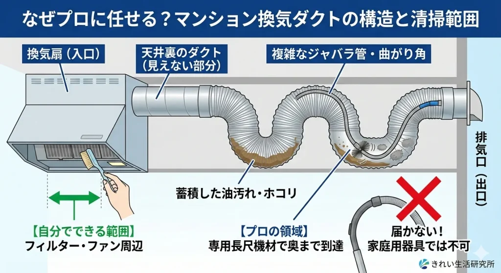 | 築20年以上のマンション | 点検推奨 | 汚れだけでなく、ダクト自体の劣化や結合部の緩みを確認する必要があります。 |