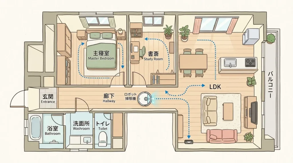 この機能がないモデルは、いわば「目をつぶって手探りで掃除する人」。壁にぶつかったら方向を変え、ランダムに動き回るだけなので、同じ場所を何度も通る一方で、隅っこは素通りということが起こります。一方、マッピング機能を持つモデルは「部屋の地図を持って計画的に掃除する人」。LDKから廊下を通って寝室へ、そして書斎へと、無駄なく順番に巡回してくれます。