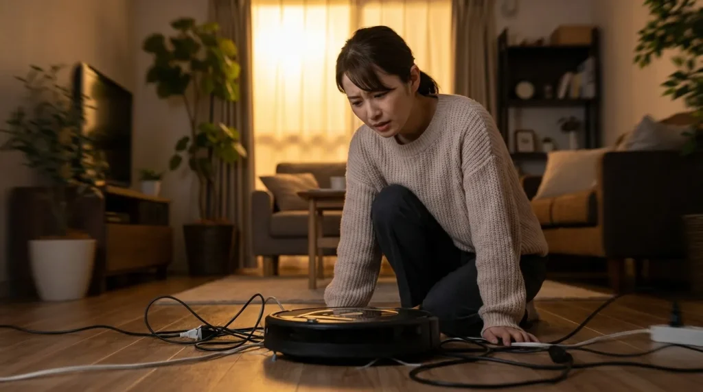 ロボットにとって最大の天敵は、床を這う「コード類」です。サイドブラシに絡まって力尽きている姿を見るのは、持ち主としても心が痛むものですよね。