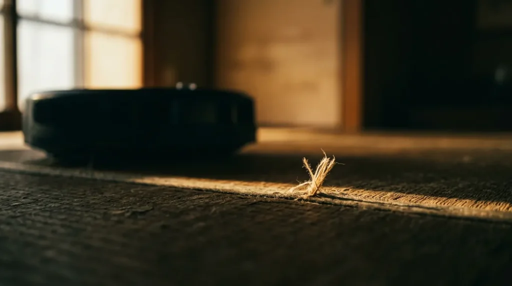 見つけたらすぐに、ハサミや爪切りで根元からそっとカットしてください。これを放置してロボットを走らせると、ブラシが毛羽立ちを引っ掛けて傷をどんどん広げてしまいます。見つけたその場で「お疲れ様」と整えてあげる。その小さな手入れが、和室の美しさを長く保つ秘訣ですよ。