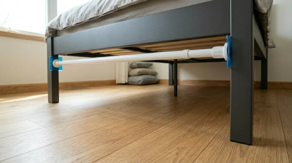 100均の突っ張り棒を使っていて一番ストレスなのが、ふとした瞬間に「ガタン!」と落ちてしまうことですよね。特にベッドフレームがスチール製だと滑りやすく、固定が難しいものです。