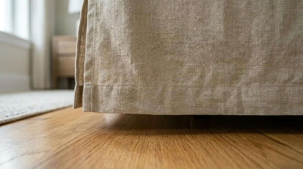 理想の丈は、「床から1〜2cmほど浮いている状態」です。布が床に引きずってしまうと、どうしても床の埃を布が直接吸い取ってしまい、汚れやすくなる原因になります。また、このわずかな隙間があることで、足元の空気がスムーズに循環し、ベッド下に湿気が溜まるのを防いでくれる効果もありますよ。