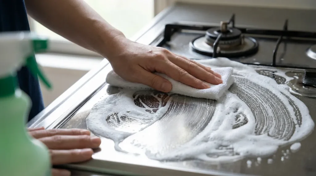 ギトギトの油汚れには、直接スプレーして少し時間を置くのが正解です。特に頑固な場合は、スプレーした上にキッチンペーパーを被せ、さらにその上から追いスプレーをする「泡パック」を試してみてください。